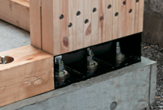 熊本地震に代表されるような震度6や7クラスの地震が来ると、建物の柱に非常に大きな「引抜き力」が加わります。大地震で倒壊している建物をみると柱が土台から引き抜かれている現象を多く目にします。 SE 構法では専用の柱脚金物を使用。高強度なアンカーボルトと相まって一般在来軸組構法の約 5 倍の強度を確保しています。