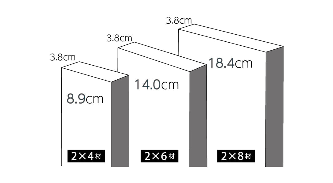 ■ 2×4といっても、2や4は未乾燥・製材前の寸法で、流通している乾燥・製材済の製材は一般的に38㎜×89㎜となります。同様に2×6材は38㎜×140㎜、2×8材は38㎜×184㎜となります。