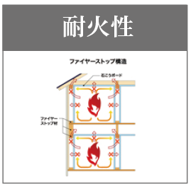 壁や天井内部の要所(壁の内部などの接合部)に木材や断熱材のファイヤーストップ材を設けて、 火が燃え広がるのを一定時間食い止めます。