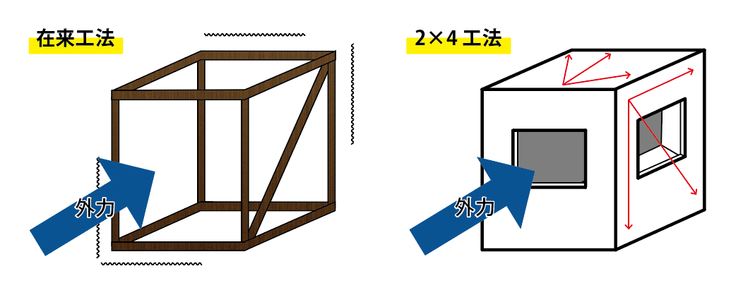 在来工法が点と線で家を組み立てるイメージなのに対して、2×4工法は壁・床・天井の6つの面で家を組み立てるイメージです。6面体で構成されている2×4工法は、水平・垂直どちらの方向からの衝撃(外力)を受け止めても面全体でバランス良く受け止め、分散吸収することができます。