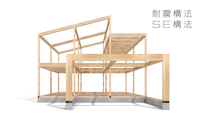 柱や梁そのものを互いに剛接合し、強固な構造躯体をつくり上げる。 従来、鉄骨造やRC造において主流だったラーメン構法を、日本の木造住宅に取り入れたのがSE構法です。