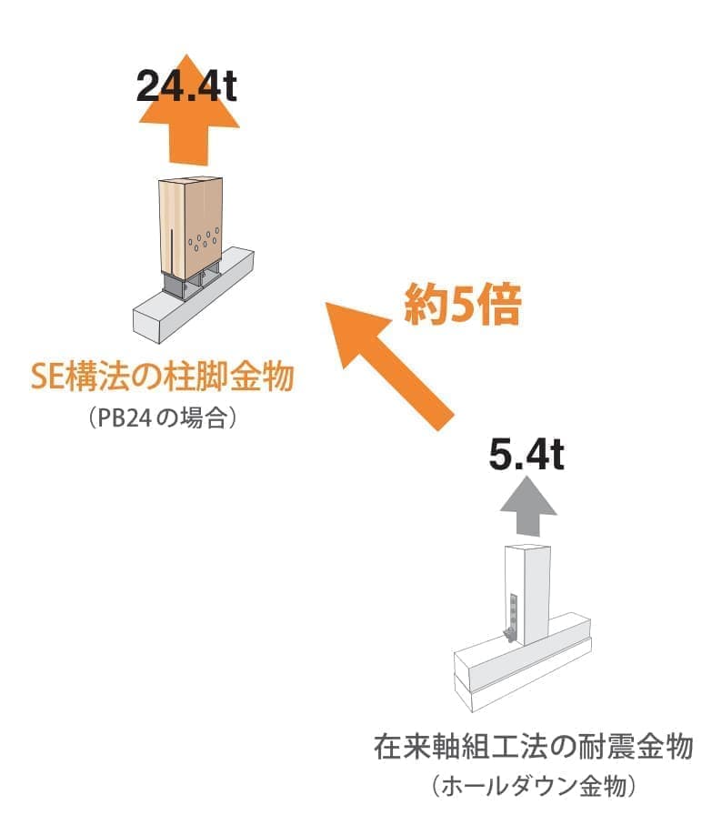 熊本地震に代表されるような震度6や7クラスの地震が来ると、建物の柱に非常に大きな「引抜き力」が加わります。大地震で倒壊している建物をみると柱が土台から引き抜かれている現象を多く目にします。 SE 構法では専用の柱脚金物を使用。高強度なアンカーボルトと相まって一般在来軸組構法の約 5 倍の強度を確保しています。
