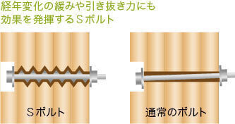 SE構法ではこの課題を克服するために「 Sボルト」という特殊なボルトを全棟標準で採用しております。